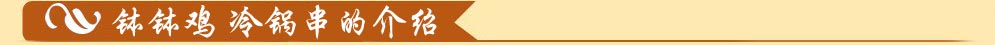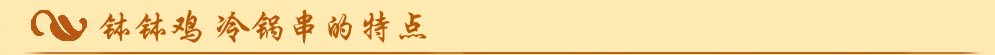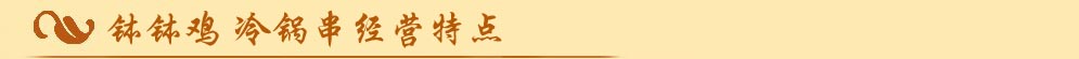 钵钵鸡 冷锅串串香是将鸡肉块及杂碎在调味锅里煮熟后放入特别红油钵钵里冷卖的一种小生意。钵钵鸡菜是真正的冷食品。钵钵鸡不仅卖鸡肉同时其他荤菜和素菜均销售。钵钵鸡的味重在红油上,特香特有麻辣味的红油是钵钵鸡取胜的根本。