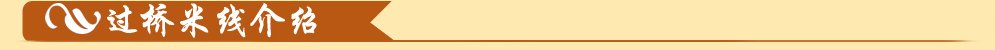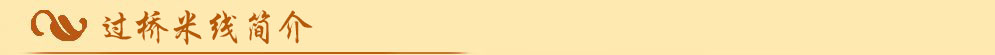 很久很久以前,在风景如画的大理国,一位贫家秀才为了能安静的读书,每天天不亮就到竹林中苦读,他的妻子在给他送饭的途中总要经过一座长长地曲径木桥,往往到了那里,饭就凉了。当她看见丈夫的衣襟已经被露水浸湿,冻的直抖,还要咽下冰凉的饭菜时,心里很不是滋味。聪明贤惠的妻子想出一个好办法,她每天用鸡汤将米线煮透,盛在瓷碗里,再浇上一层油汁。这样米线在油的保温下,就不会凉得太快了,而且米线吸收了鸡肉汁的鲜香,别有一番美味!每当妻子看着秀才吃着熟熟的米线,就会开心的微笑;而秀才品味到妻子的良苦用心,便更加发奋读书了。终于秀才考中了状元。他满怀欣喜和感激的心回到家乡,想将与自己相濡以沫的妻子接到京城时,竟得知妻子因操劳过度已经死去了......