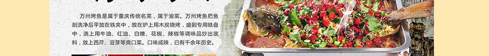 万州烤鱼是属于重庆汉族传统名菜,属于渝菜。据说万州烤鱼的由来是从非洲传来的,一名捕到鱼的非洲土著,烤了很久鱼还未熟, 便把那条鱼加入汤汁调味料边吃烤,发现比以往任何时候都鲜美,从此就有了这道美味,烤鱼相传已有千余年历史。 万州烤鱼把鱼剖洗净后平放在铁夹中,放在炉上用木炭烧烤,盛到专用铁盘中,浇上用牛油、红油、白糖、花椒、辣椒等调味品炒出底料, 放上西芹、豆芽等爽口菜。成菜带酒精炉上桌, 可以起到很好的保温作用,食客吃完主料后还可以根据个人口味继续涮食蔬菜。万州烤鱼将腌、烤、炖三种烹饪方法有机结合,香味浓郁、汤色红亮、辣而不燥、外皮香脆、肉质鲜嫩, 具有独特的焦香味和浓郁的料香味! 在回放千百年饮食文化的同时,也引领了现代烤鱼新时尚。