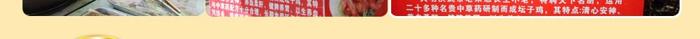 坛子鸡腿 ★坛子鸡中翅 ★坛子鸡全翅 ★透骨香鸡脖 ★香辣鸡腿 ★麻辣鸡翅 ★麻辣鸡腿 ★串香鸡胗 ★麻辣鸡肝 ★鸡汁香干 ★鸡汁藕片 ★鸡汁海带 ★鸡汁千张节等等。 |