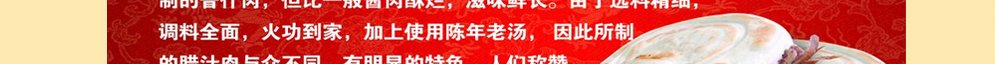 西安腊汁肉历史悠久,远近闻名。其色泽红润,气味芬芳,肉质软糯,糜而不烂,浓郁醇香,入口即化。素有“肥肉吃了不腻口,瘦肉无渣满口油”的赞语,用白吉馍夹腊汁肉,更是别有风味。俗称腊汁肉夹馍。合腊汁肉、白吉馍合为一体,互为烘托,将各自滋味发挥到极致。馍香肉酥,回味无穷。 里脊肉夹馍,馍里面夹的是鲜嫩可口的里脊肉,配上煎蛋和生菜,再挤点风味酱,吃后让人回味无穷。制作时,选取上等里脊肉,按照我中心提供的独特秘方腌制,然后在铁板台上煎熟,饼也在铁板上烙好,整个制作设备,就是一个铁板台,投入少,回报快。